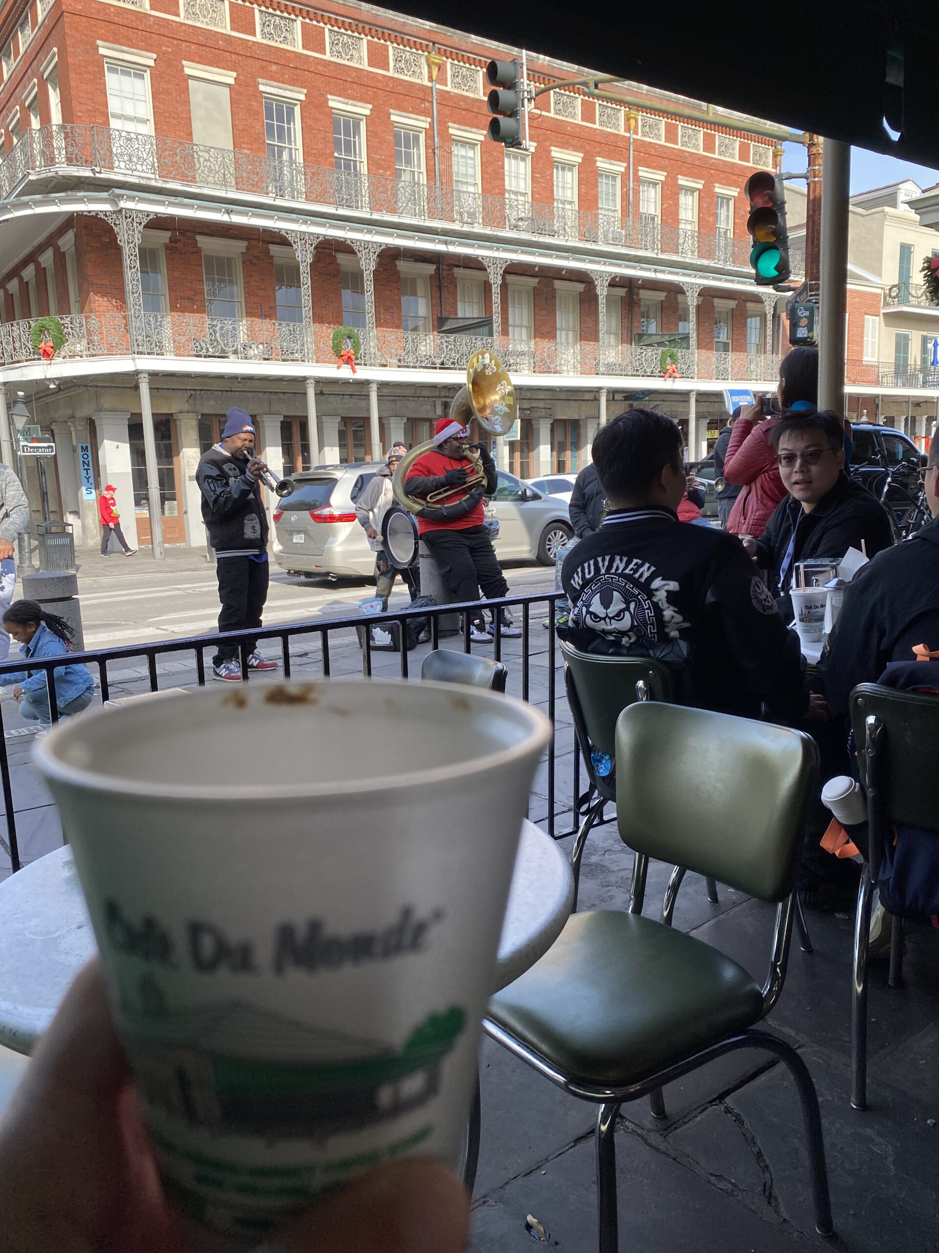 Podróż rozpoczęła się chronologicznie względem historii muzyki – w Nowym Orleanie, gdzie narodził się nowoorleański jazz, ragtime – najczystsza forma transformacji muzyki poważnej w muzykę rozrywkową. Nie wiedzieliśmy czego spodziewać się po blisko stu latach od tych wydarzeń w sercu Nowego Orleanu – French Quarter? Tego samego klimatu? Próby jego odtworzenia? O wrażeniach za chwilę. Dzień rozpoczęliśmy kawą w kultowej Cafe Du Monde – przyjemne miejsce z sentymentem europejskim – smaczna kawa z ekspresu, z mlekiem (nie śmietanką), podawana ze świeżymi pączkami – duża ekstrawagancja w USA! 😊